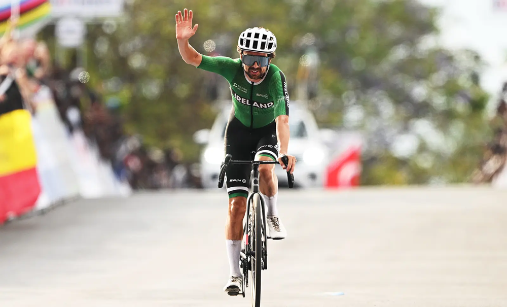 Ir Ben Healy s úsměvem na tváři a mávaje davu překročil cílovou čáru jako třetí po nezapomenutelném dni cyklistických závodů v Kigali v Rwandě. Kanaďanka Magdeleine Vallieresová v silničním závodě žen slavila vítězství.